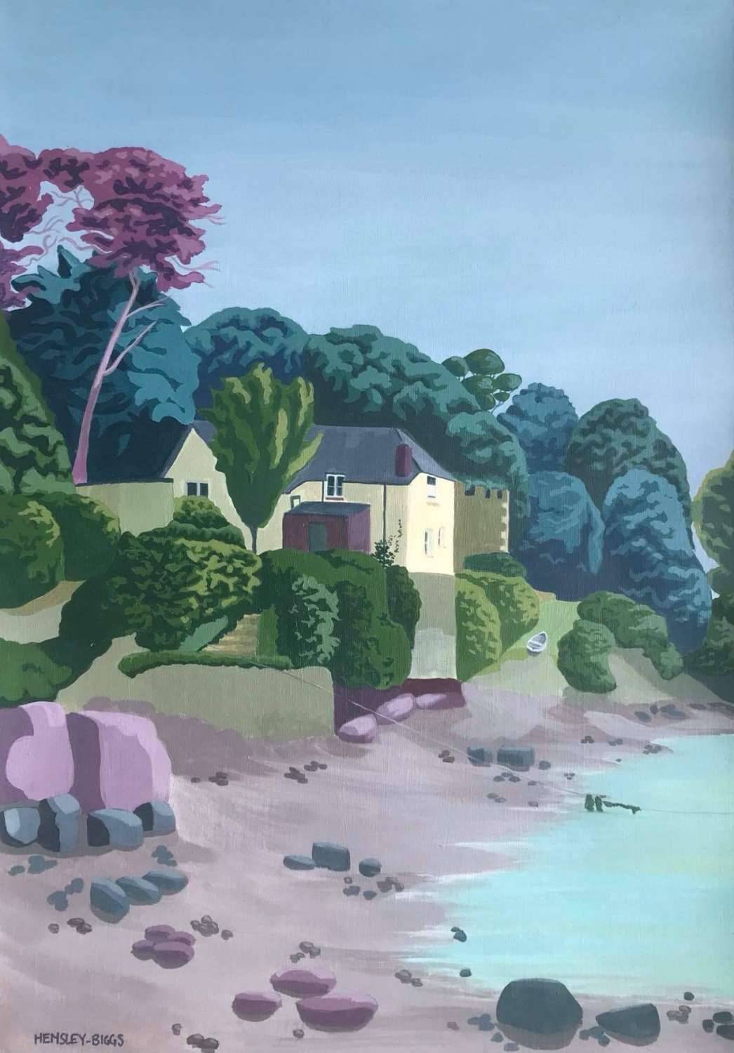 Golden Gear Cottage is nestled into the south west coastal path and is part of the hamlet of Treath on The Helford River. It is clearly visible from the north side and the water as the north side wall falls down to the shoreline. The cobbled beach is accessible from the coast path and is well worth the climb down the granite steps, to rest a while and enjoy the views up and down the river. Here I wanted to capture the feel of the evening shade and light, the warmth and gentleness in the foliage that caresses the buildings going deep into the surrounding woodland .
